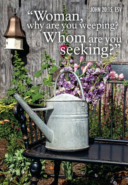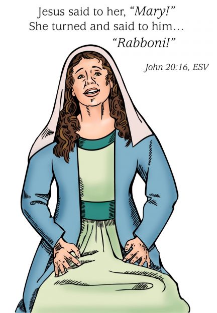 13 They said to her, ‘Woman, why are you weeping?’ She said to them, ‘They have taken away my Lord, and I do not know where they have laid him.’ 14 When she had said this, she turned around and saw Jesus standing there, but she did not know that it was Jesus. 15 Jesus said to her, ‘Woman, why are you weeping? For whom are you looking?’ Supposing him to be the gardener, she said to him, ‘Sir, if you have carried him away, tell me where you have laid him, and I will take him away.’ 16 Jesus said to her, ‘Mary!’ She turned and said to him in Hebrew, ‘Rabbouni!’ which means Teacher. 17 Jesus said to her, ‘Do not hold on to me, because I have not yet ascended to the Father. But go to my brothers and say to them, “I am ascending to my Father and your Father, to my God and your God.”